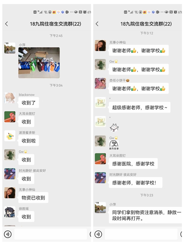 4月17日,鞠老师拿到物资后,进行消杀、分包,把家里能用的袋子都找出来了,最后还细心地贴上姓名和房间号,以便确保物资顺利到达学生手中。然而,眼下的道路交通却又成了摆在面前的一道难题,面对花花绿绿十几包沉甸甸的防疫物资,鞠老师愁眉不展,所幸最后几经波折终于顺利将这一份份承载着学院领导和老师们关爱之情的防疫物资送达酒店。农历三月,气温并不很高,鞠老师忙碌奔波却已是满头大汗,他一边擦拭汗水,一边反复叮嘱:“一定要送到学生房间门口哦,注意无接触配送,一定要提醒学生再次做好消杀,静放一段时间再打开用”。