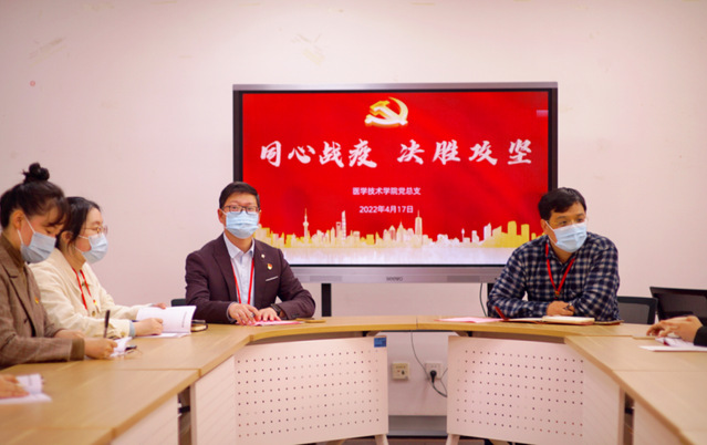 李延飞传达了教委、学校近期关于疫情防控有关精神。他从学校就医流程、现场核酸检测、食堂餐饮供应情况、物资配送消杀、校园环境卫生保障等方面,重点介绍了一个多月全校师生齐心协力,共同坚守来之不易的防疫成果。李延飞强调,当前,正是疫情防控吃劲的关键时期,越是困难时,党员干部越要冲在前,希望全体党员,履行党员责任和义务,深入宿舍,了解同学困难,回应解答同学的难题。李延飞再一次向全体党员传达了学校领导的防疫指示:“越是在疫情的最后,我们健康学子越要坚守阵地,守好防线,坚持再坚持,胜利属于人民、属于上海健康医学院。”
