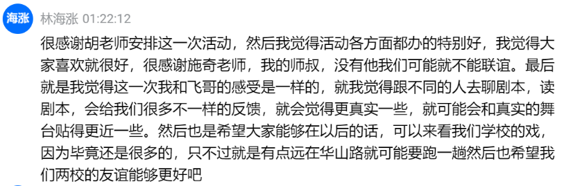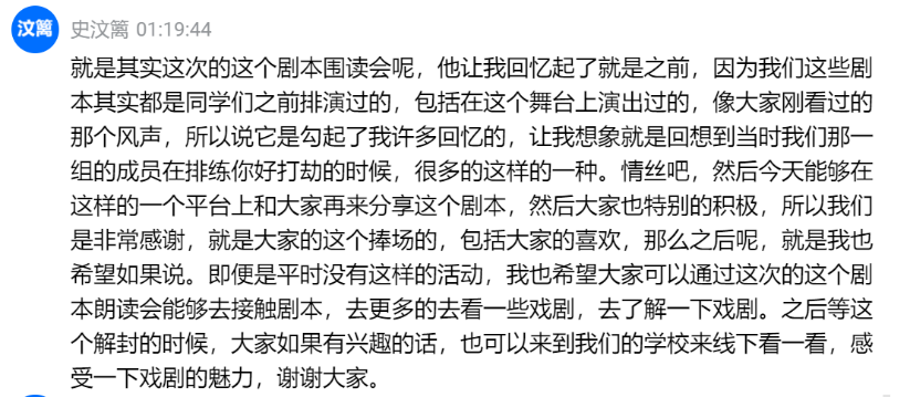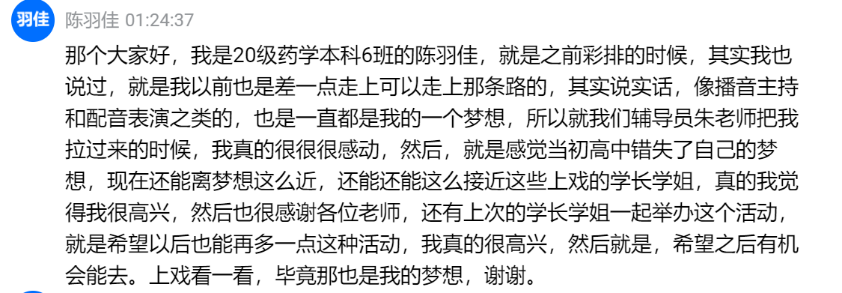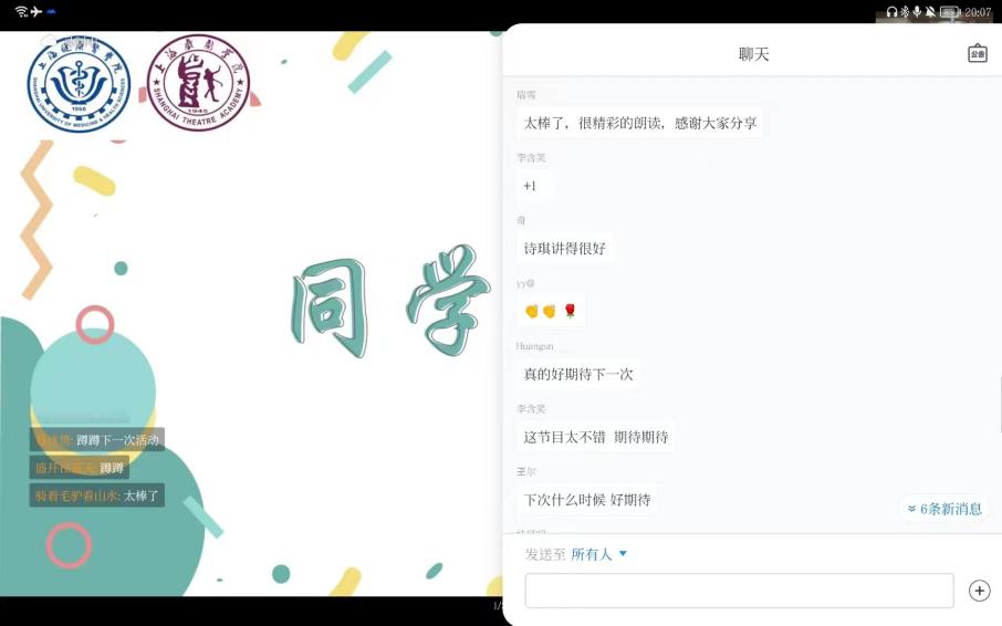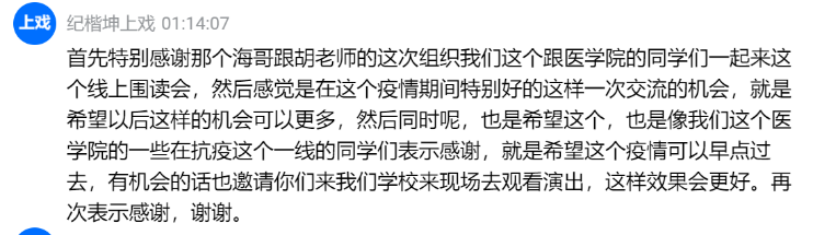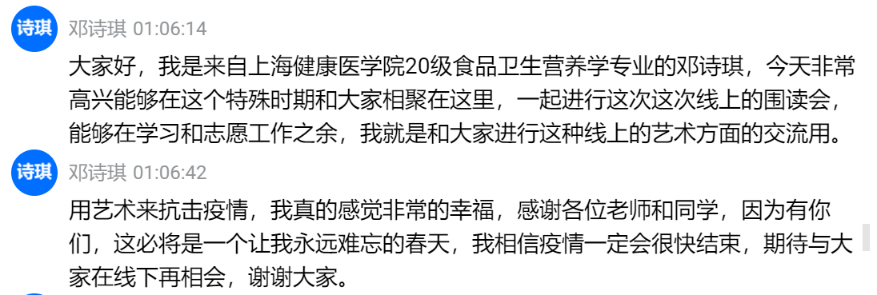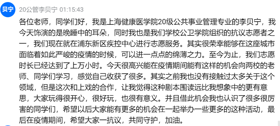 活动结束后,两校同学们意犹未尽,继续进行了在线云交流,纷纷表达了以“艺”抗疫,共同守“沪”的激动心情。医学院的同学们深深感受到了戏剧艺术的精彩和魅力,戏剧学院的同学们也表达了对医学和医务工作者的感谢和敬意。疫情期间,两校同学们通过本次云联谊活动,增进了了解和友谊,相约待疫情散去,线下再相聚。(北苑综合办、校团委、护理与健康管理学院)