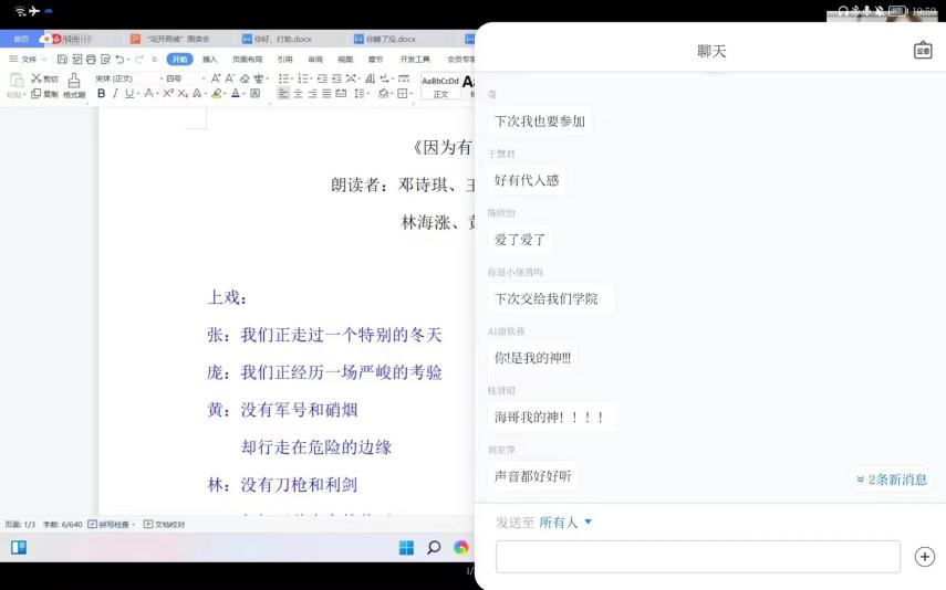 护管学院驻校辅导员胡雪东主持围读会。本次围读会作品题材多样、人物形象生动,包括剧本围读《你好,打劫》、《你睡了没》、《风声》、《金陵十三钗》、《让子弹飞》以及朗诵《因为有你》等节目(精选视频附后)。两校同学各自挑选角色进行合作表演,虽然没有闪耀的灯光、华丽的舞台,但演员们全情投入,用语言去表达情感,用肢体去演绎人物,为线上的观众们带来了一场视觉与听觉的饕餮盛宴。最后的朗诵节目《因为有你》更是由两校同学共同表达了对奋战在抗疫一线的医务工作者的由衷敬意。
