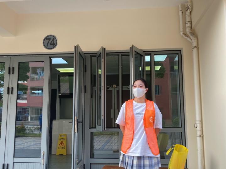 史懿婷同学在疫情居家隔离期间,不惧危险,主动报名成为浦东新区高桥镇富特社区志愿者。