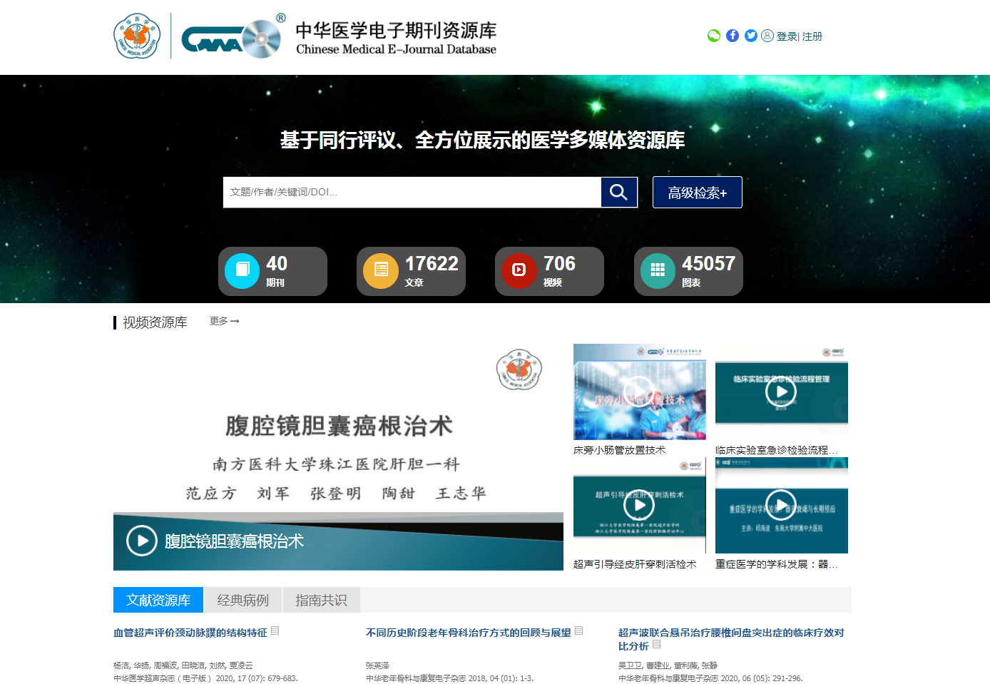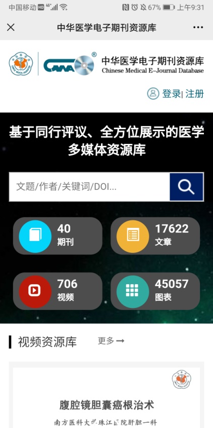 “中华医学电子期刊资源库”是中华医学电子音像出版社打造的国内首个基于同行评议,通过图、文、声、像全方位展示, 集医学视频、学术文献、在线专科教育等医师服务于一体的医学多媒体数据库。数据库囊括了40种中华医学会电子版系列期刊出版的医学视频、传统论文、学术图表、经典病例等内容,目前包括900余部视频、 17181余篇传统论文、917个经典病例、43548个学术图表、437个指南共识,其中视频数据为2007年至今,传统论文数据为2010年至今。同时,该数据库平台与中华医学教育在线、中华医学在线专科教育学院、继续医学教育项目、中华医学书屋等平台资源实现链接,可为临床医生提供全面的学术内容和教育培训服务。平台所有页面支持PC端和移动设备访问,为临床医生利用碎片化时间进行阅读和观看提供了极大的便利条件。