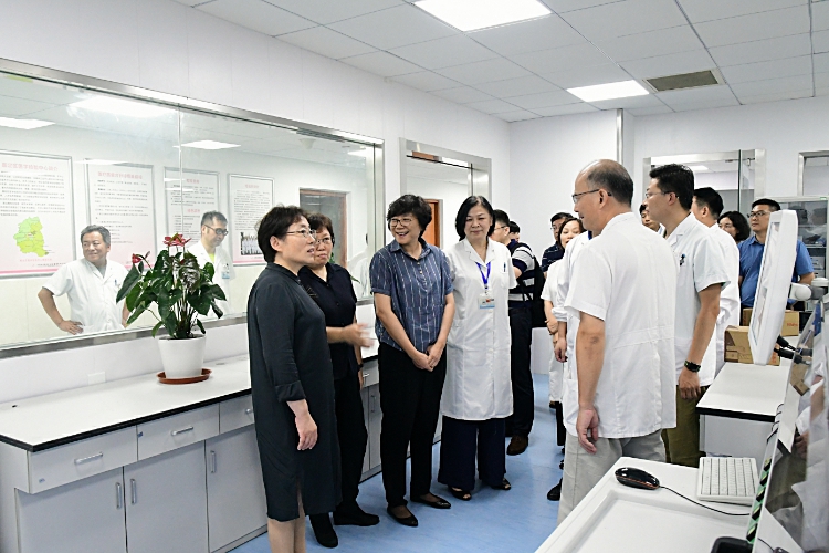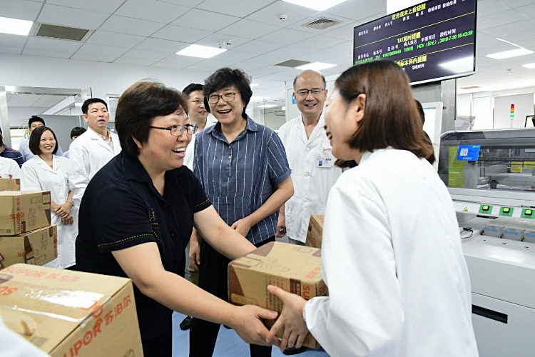 随后,领导们一行来到区域临床检验中心,慰问医务人员的同时,参观了于今年5月正式上线运行的全市最大的一条单体生化免疫全自动化双轨道流水线检验分析系统。当了解到区域检验中心日均处理标本量8000以上,最高峰达到了11000以上时,领导们对医务人员在“战高温”中体现出的责任和担当,予以高度褒奖。