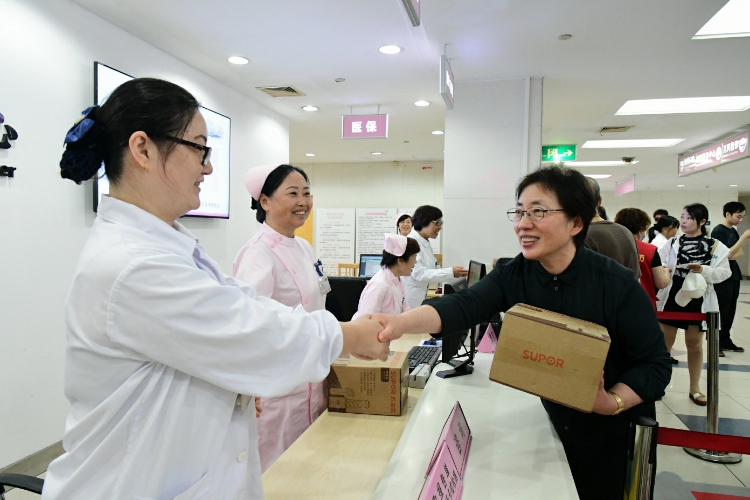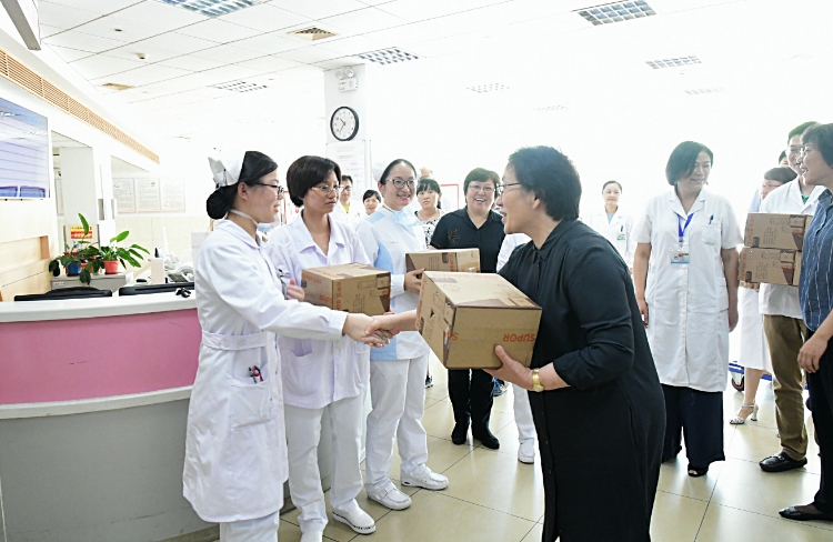 在医院门诊大厅,慰问领导们一一与预检护士和便民服务中心工作人员握手问候,并送上慰问品。当看到儿科补液室的护士姐妹们忙得脚不点地,郑沈芳书记特地关照大家在保障医疗安全的同时,要照顾好自己的身体,注意劳逸结合。