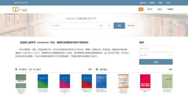 为丰富我校图书馆数字馆藏资源,助力教学科研,现长期开通Iresearch(爱学术)电子书库试用。该数据库是外文电子书集成平台,为读者提供快捷、个性化的阅读服务。爱学术目前已上线超过47万种外文学术电子书,其中包含4万余种免费资源,已有300多家国际出版品牌入驻,覆盖了人文社科、理工农医全学科,以权威、优质的海量资源满足教学与科研需求。