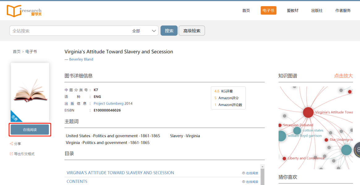 访问平台首页www.iresearchbook.cn,点击右上角的电子书