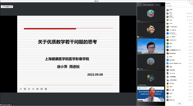 98日,医学影像学院以“看齐合格评估标准,助力上健医发展”为主题,在线召开了兼职教师培训会,会议由徐小萍院长主持,67位专兼职教师参加。参会成员包括历年承担学院教学任务的仁济医院、第九人民医院、附属周浦医院、附属嘉定区中心医院课程团队,以及今后将加盟的附属崇明医院、附属奉贤中心医院的教师,我校护管学院的部分专兼职教师旁听参加了培训会。