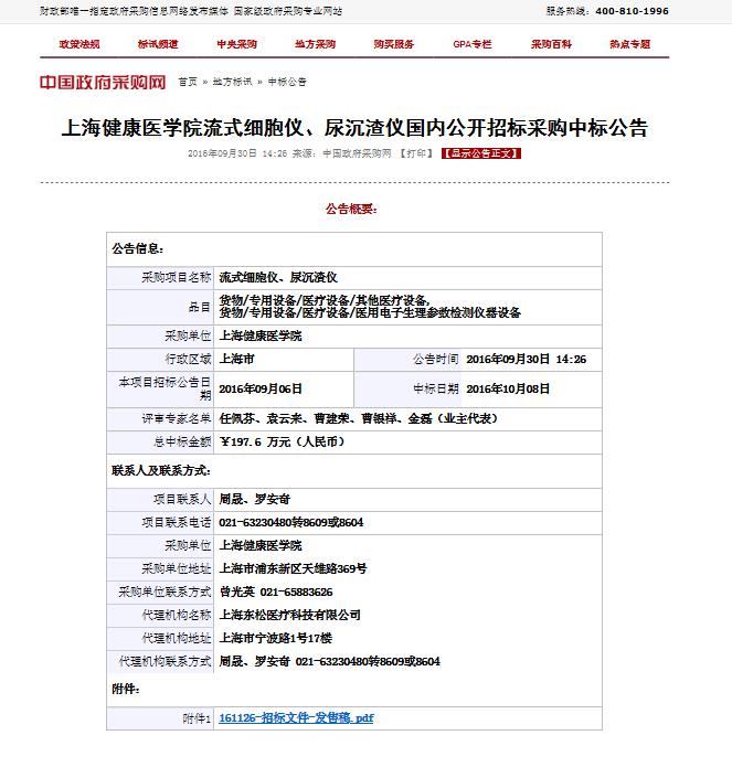 上海健康医学院流式细胞仪、尿沉渣仪国内公开招标采购中标公告
