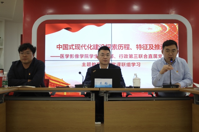 为深入开展学习贯彻习近平新时代中国特色社会主义思想主题教育,努力在以学铸魂、以学增智、以学正风、以学促干上取得成效,5月4日下午,医学影像学院学生党支部、行政第三联合直属党支部开展主题教育专题党课联组学习,校党委副书记、校长吴韬为师生党员讲授题为“中国式现代化建设探索历程、特征及推进”的专题党课。