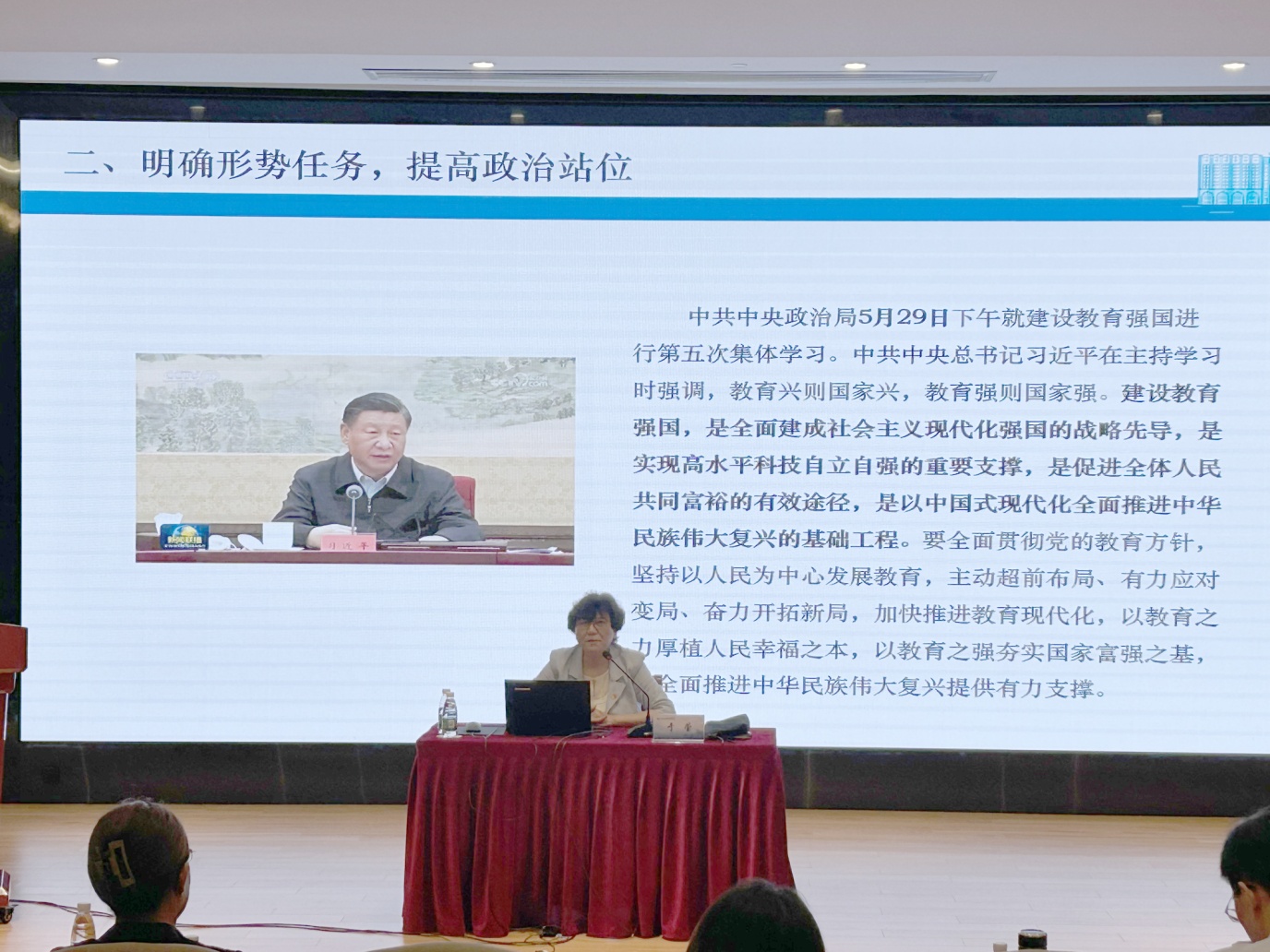 于莹从“教育是国之大计、党之大计”的战略高度,着眼办好人民满意的教育和中国式现代化进程中培育时代新人的使命任务,聚焦“心怀‘国之大者’,做新时代‘大先生’”,从“牢记实心使命,增强责任意识”“明确形势任务,提高政治站位”“加强制度建设,铸牢底线意识”“弘扬优秀文化,涵养精神品德”四个方面展开,以黄大年、李保国、李德威等优秀教师的典型事迹,基于学校在师德师风工作方面的管理举措和建设探索,带领党员教师沉浸式学习了师德师风建设的重大意义和本质要求,深刻体会领悟习近平总书记关于教师队伍建设、尊师重教社会风尚、师德师风建设、“国之大者”、涵养精神品德等重要讲话重要论述精神。